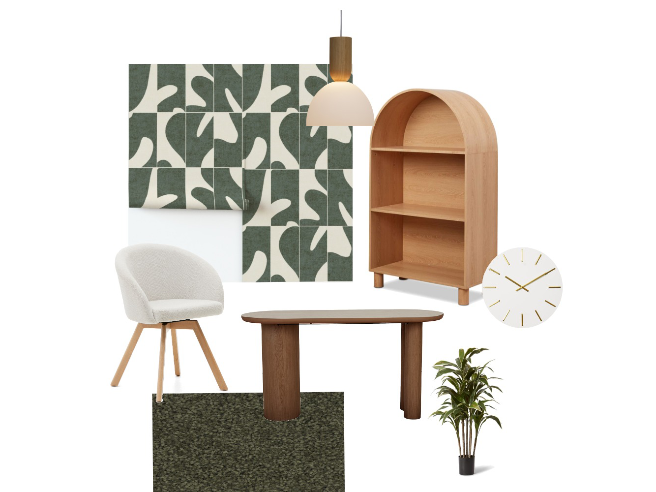 This moodboard showcases the abstract wallpaper, complemented by sleek furniture and natural decor, ideal for creating a serene and productive office environment.